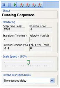 The status of the program can be monitored and the speed of the motion reduced for commissioning and testing purposes: